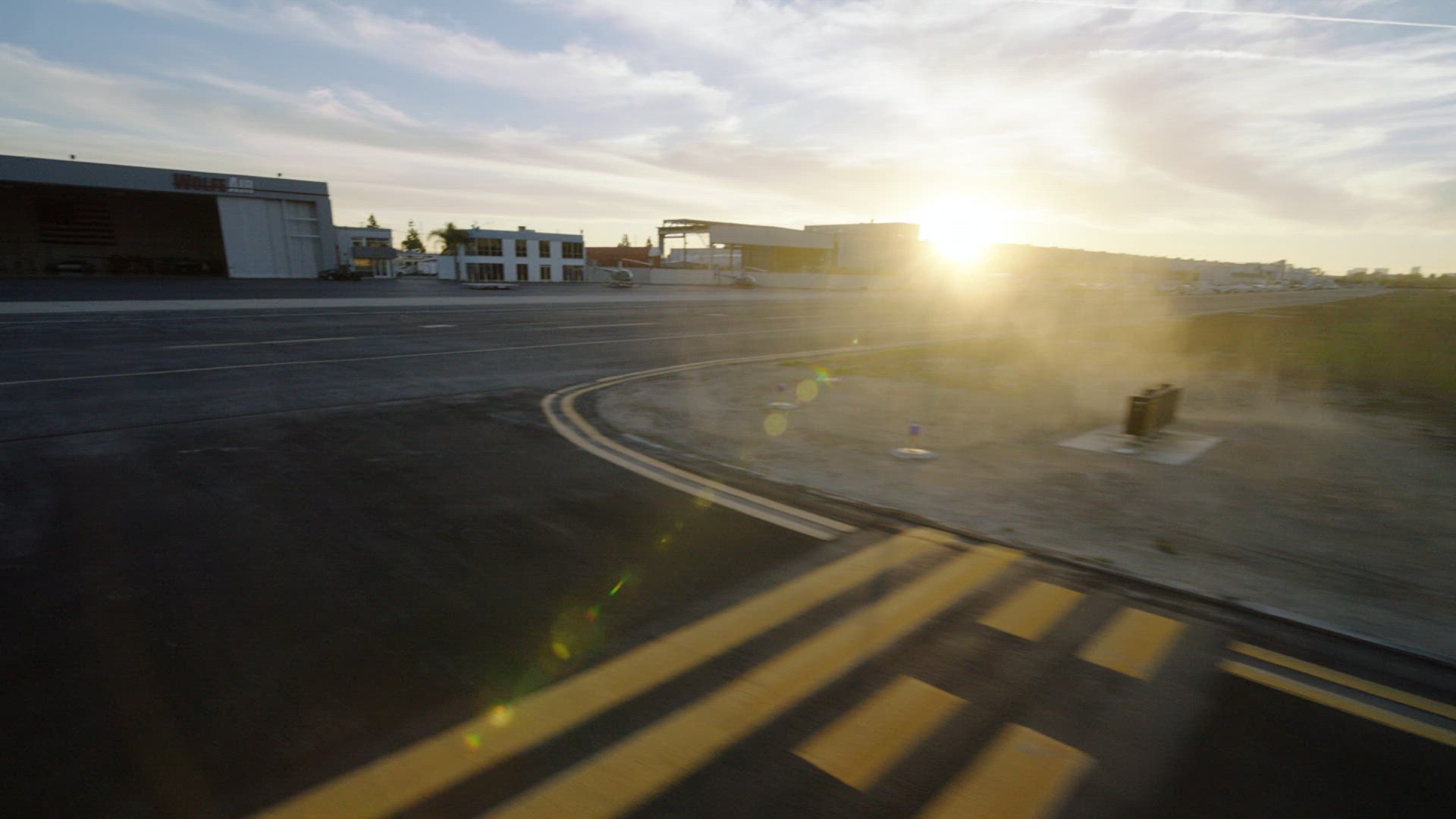 > Aerial shot of airplane landing on runway
