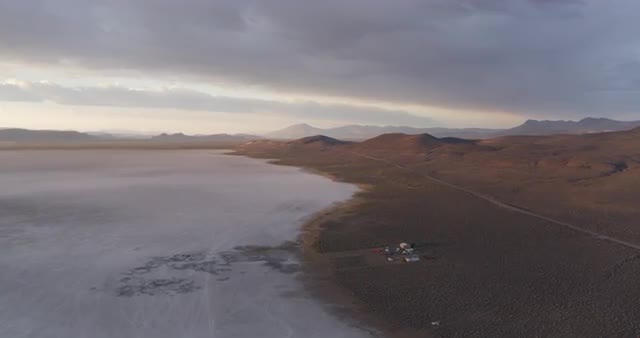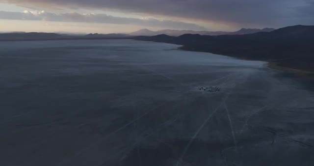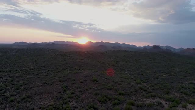 946423 - Low aerial flyover desert landscape at dusk