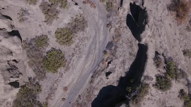 930482 - Aerial drone flyover of a rutted road in a sunny New Mexico field.