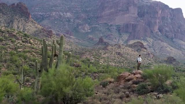 946257 - Hiker on top of desert hill, aerial flyover