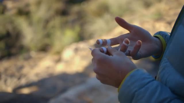 Rock climber feeling taped hands in Rocklands, South Africa.