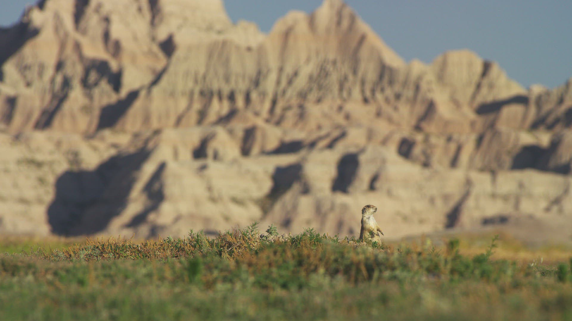2125786 - Panning view of the Badlands in South Dakota as the grass blows