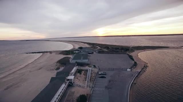 Aerial footage of Napa Tree Point in Watch Hill, RI at sunset. Camera pushes forward toward the point and sunset.