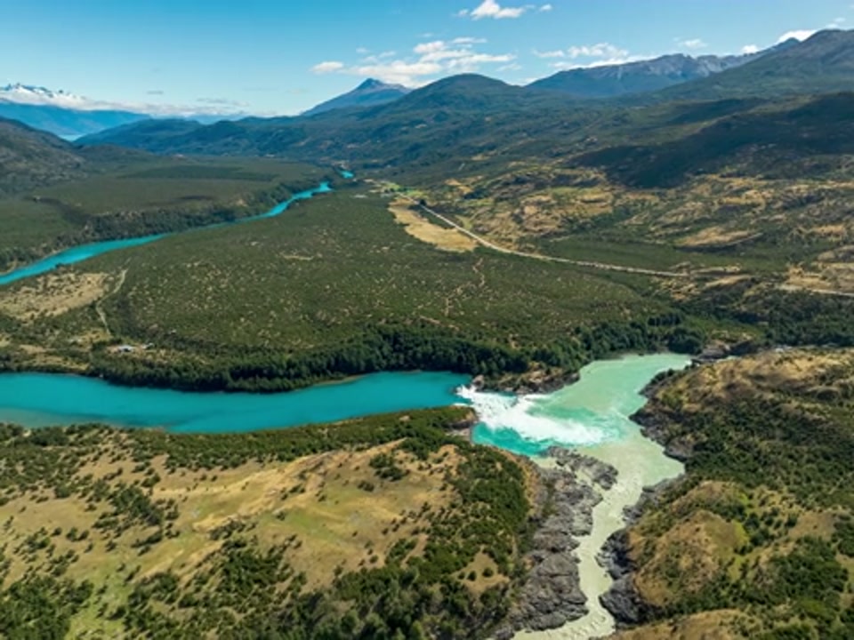 Drone orbital hyperlapse showing the stunning turquoise water confluence of Baker River in Patagonia, Chile, surrounded by wild mountains and forests.