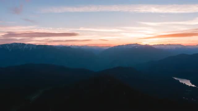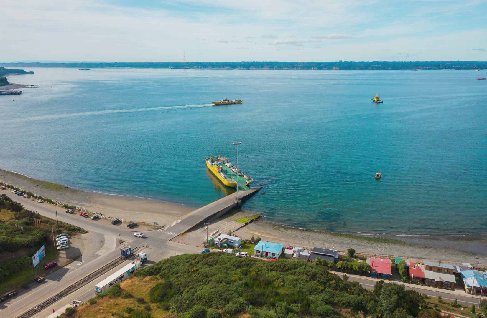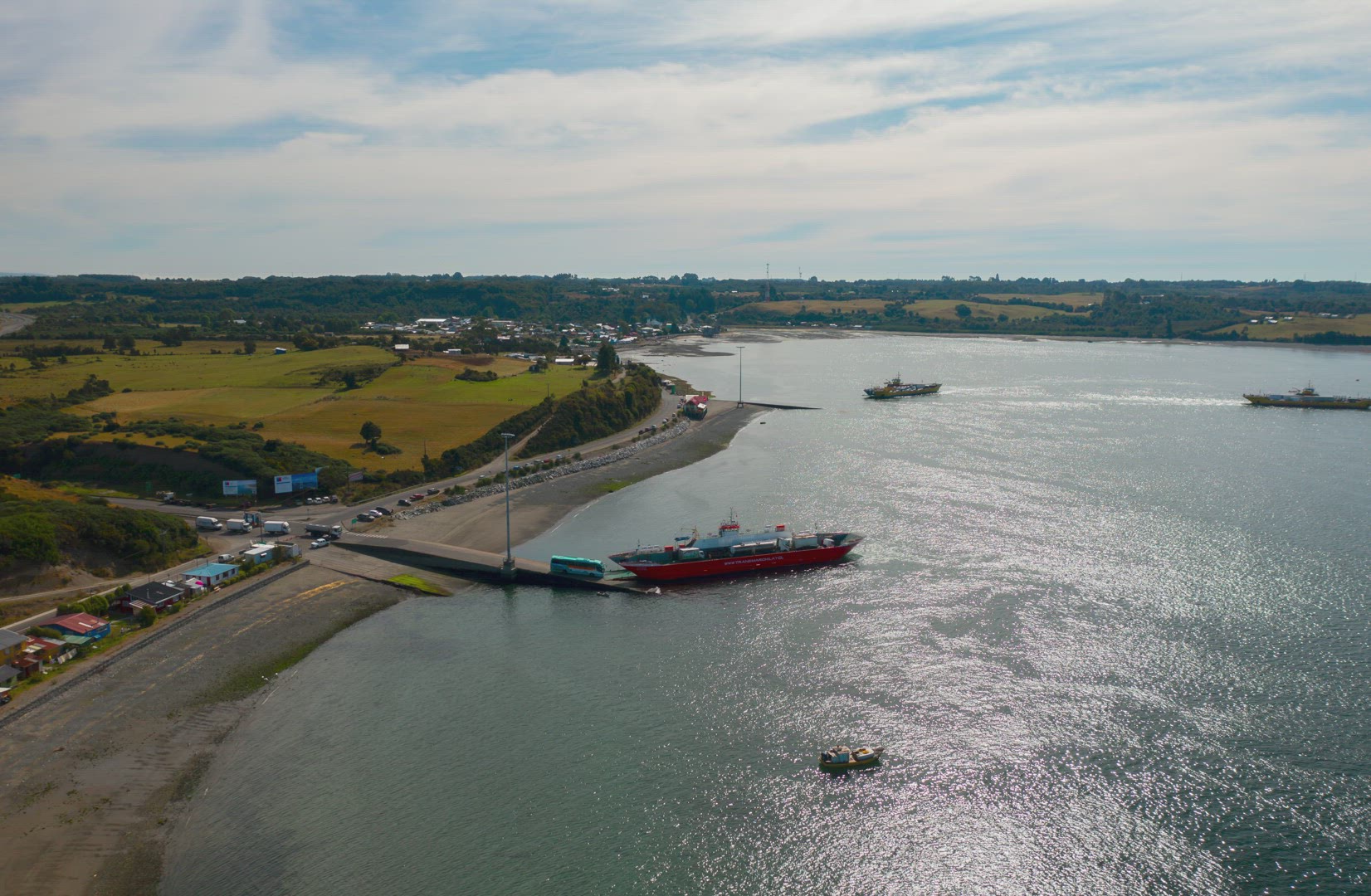 Aerial hyperlapse of a drone flying forward over lush green fields and farms in Los Lagos, Chile, showing fast-moving clouds and shadows.