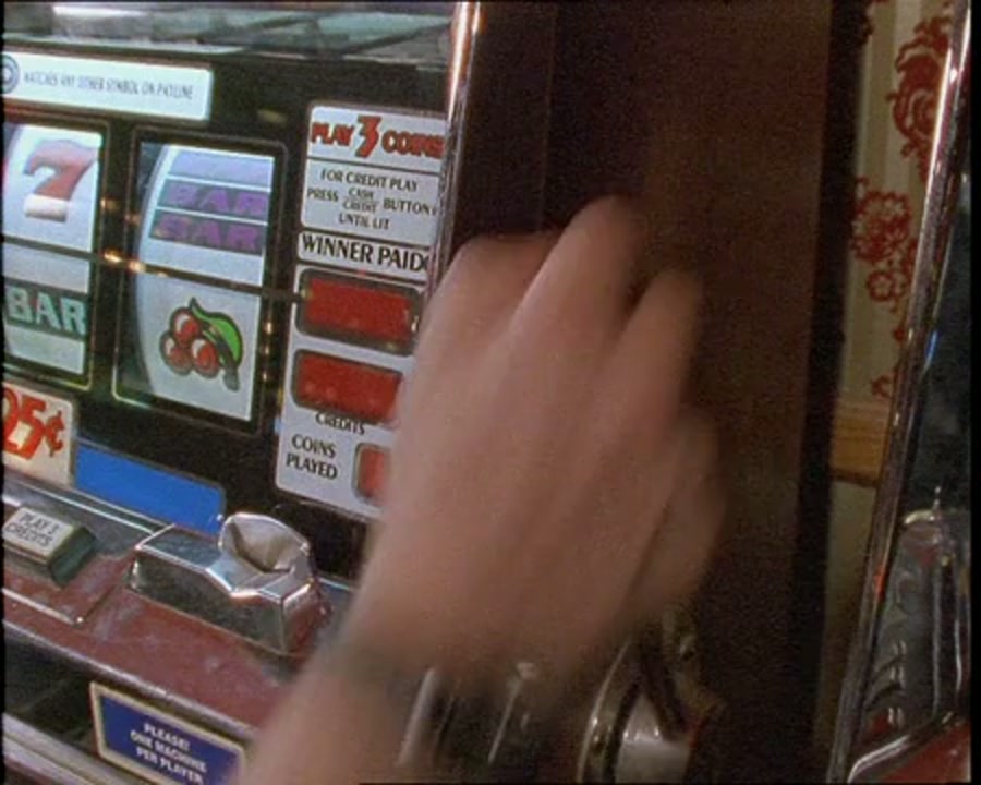 Hand pulls on lever and adds coins via slot