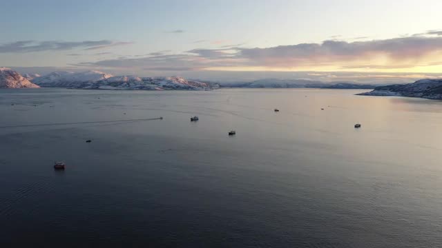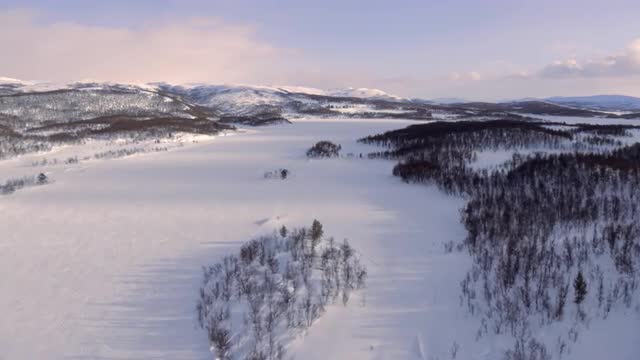 720521 - Flying over frozen lake during sunset