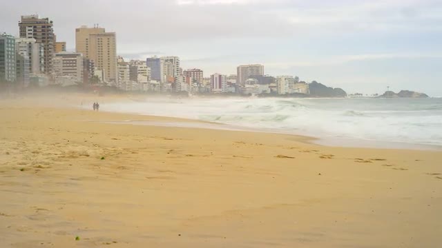 101350 - Slow motion, dolly out as waves crash against Ipanema beach at sunset