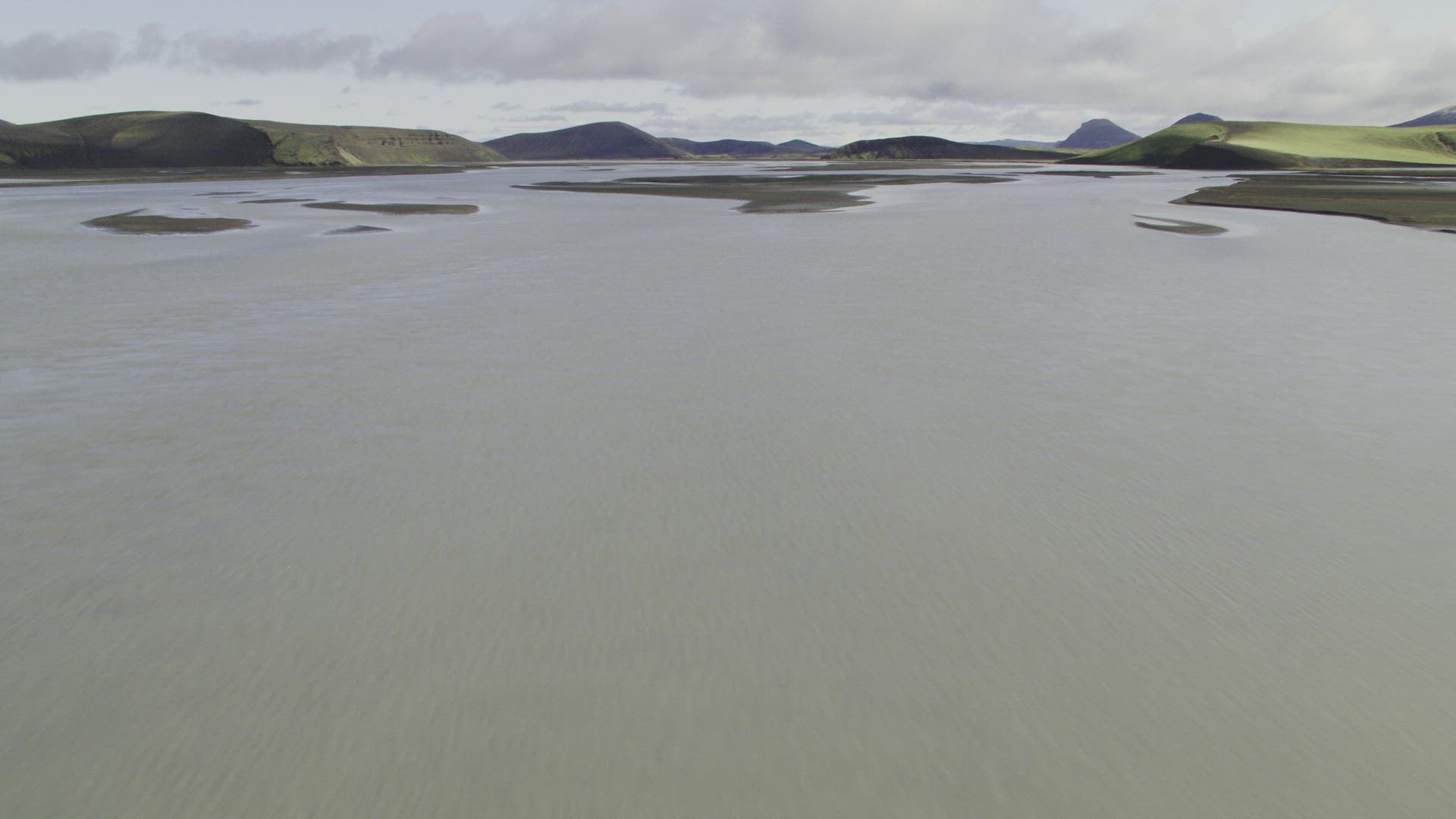> Icelandic river valley with mountains in the background