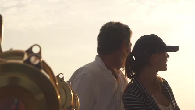 Slow Motion Of Mature Man Sitting On Boat Fishing For Big Game On Open Sea