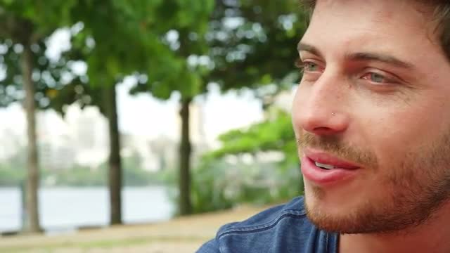 > Brazilian man talking and drinking at a cafe in Brazil