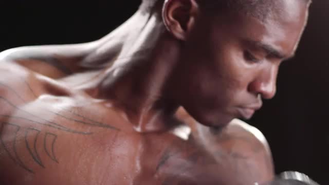 Muscular black man curling free weights