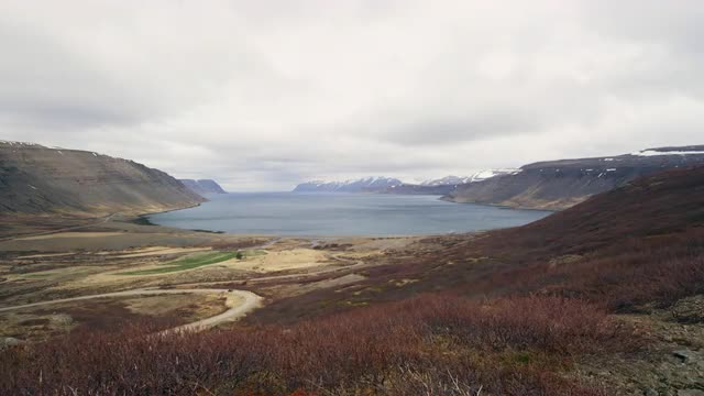 A cloudy sky snow surrounding mountains in the background. A gravel field in the foreground. Location Iceland.