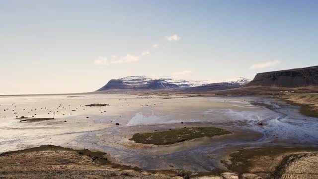 A static shot of mountains and tidal flats. Red Epic. Iceland.