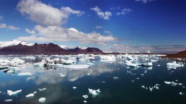 A Time lapse that pans and tilts while capturing the melting glacier ice. There is movement with both clouds and ice chunks. A sunny day in Iceland's remote nature.