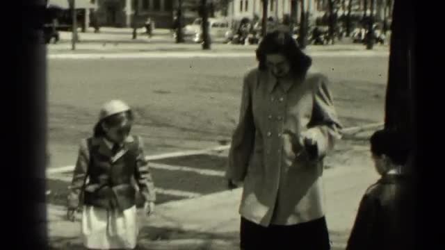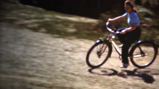 (8mm Vintage) 1949 Woman Riding Bicycle Past Old Car