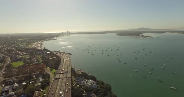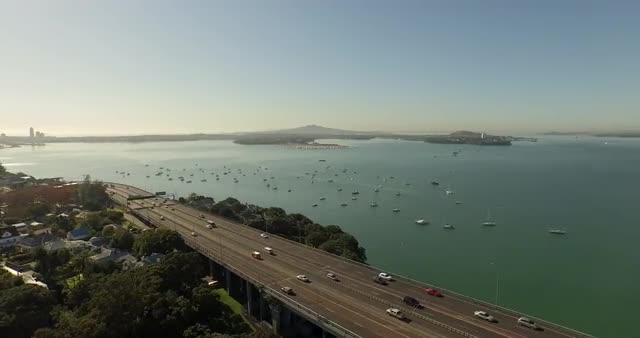 Continuation of previous shot of a low flyover of Auckland Harbour Bridge South toward St Mary's Bay and Ponsonby. 4K.