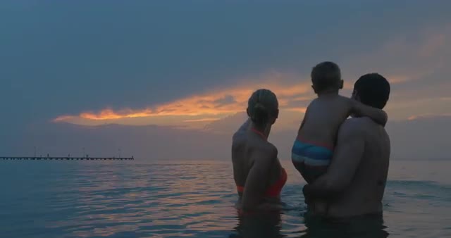 673563 - At sunset mother, father with their son swimming in sea of city Perea, Greece