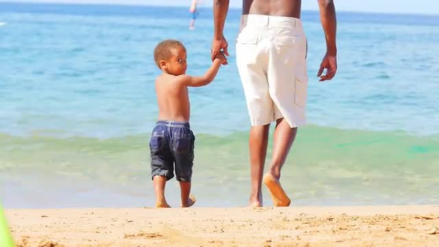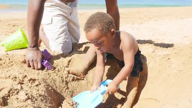 Black father recording video of his son on a beach
