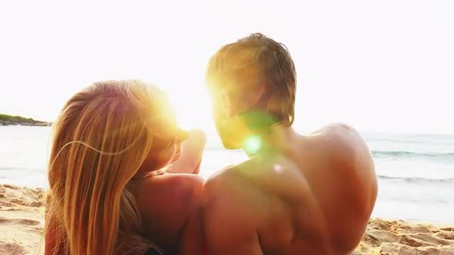 > Couple lie on a beach and look out over the ocean at sunset