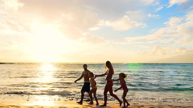 > Family walking on a beach