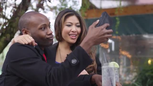 A couple taking selfies at an outdoor cafe
