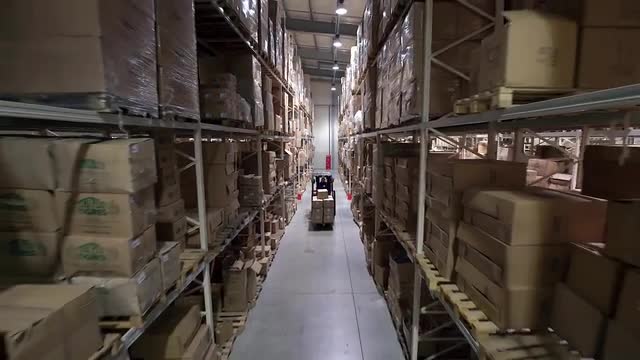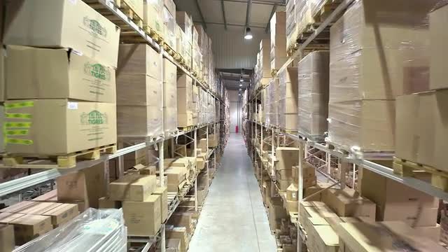 457031 - Camera Cranes Up on Shelves of Cardboard Boxes Inside a Storage Warehouse