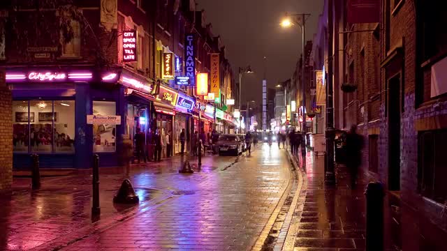 Timelapse looking down Brick Lane in London on a rainy winter evening.