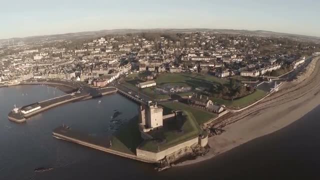 > Aerial shot flying over Broughty Castle on the river tay by Dundee