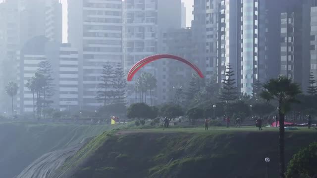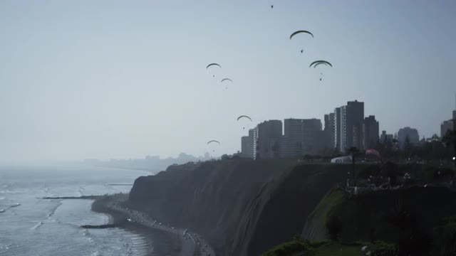 > Top shot of waves pounding a pebble beach on Pacific coastline, Miraflores, Lima, Peru.