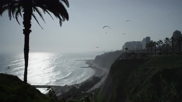 Top shot of waves pounding a pebble beach on the Pacific coastline, Miraflores, Lima, Peru.