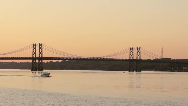 316869 - A speed boat glides under a Mississippi bridge