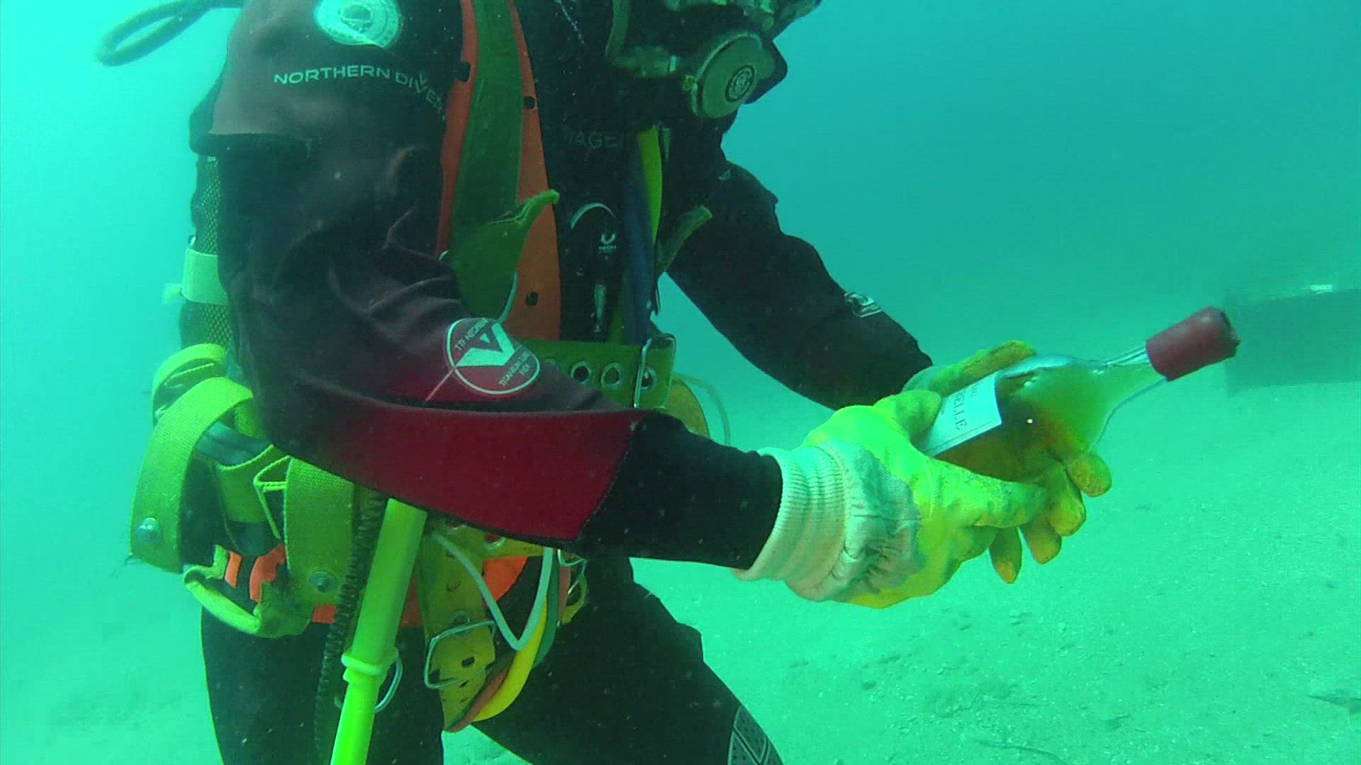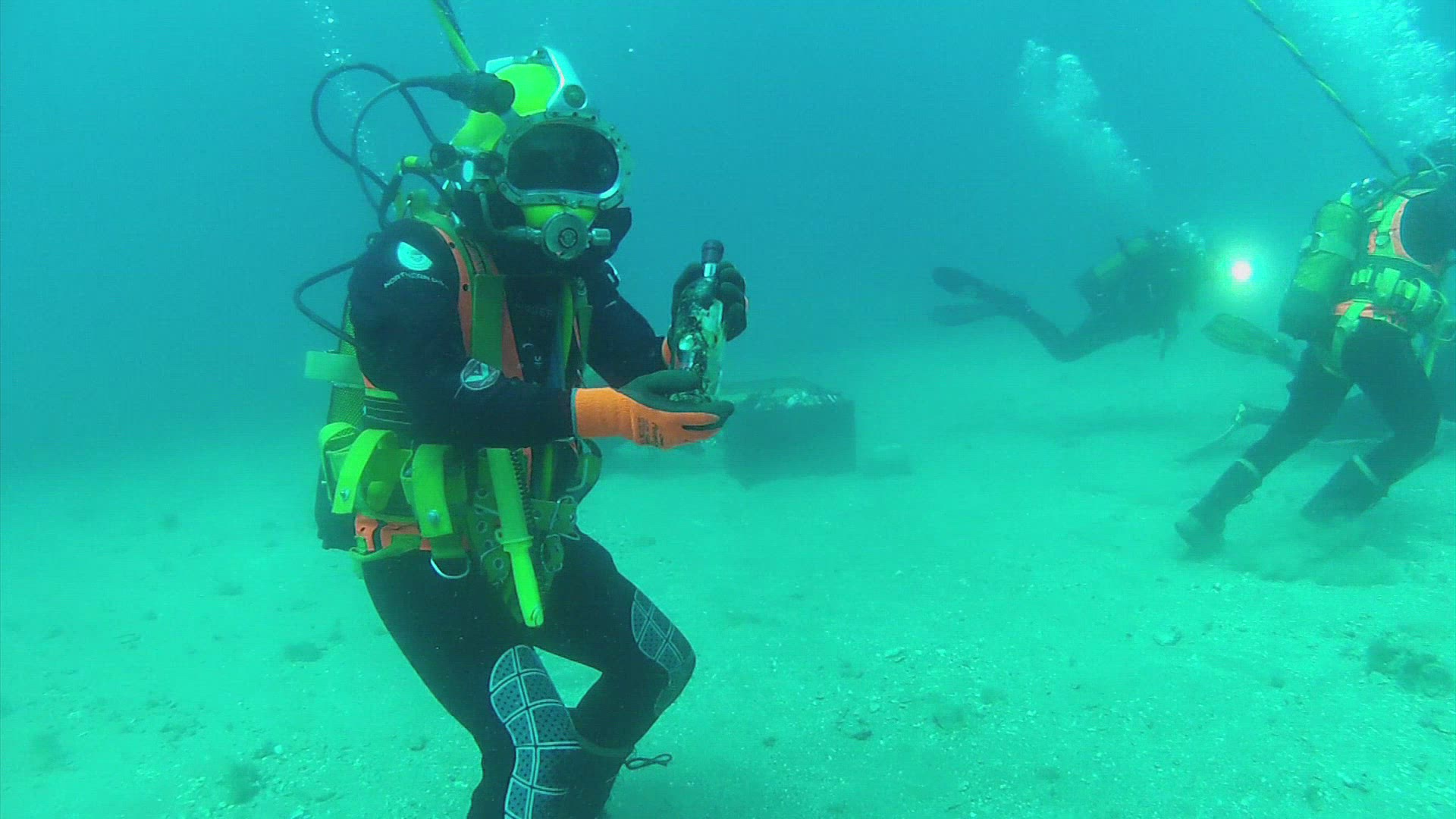 > CHATTANOOGA, USA - 1952: Man testing out new deep sea diver suit in the Tennessee River.