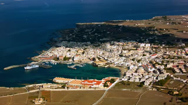 Wide shot view of a ferry docked in a small island