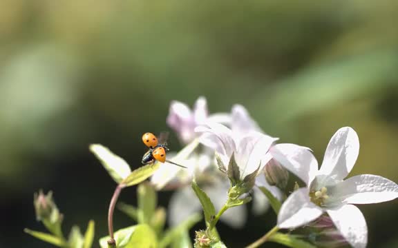 Ladybug takes off from leaf near white flowers