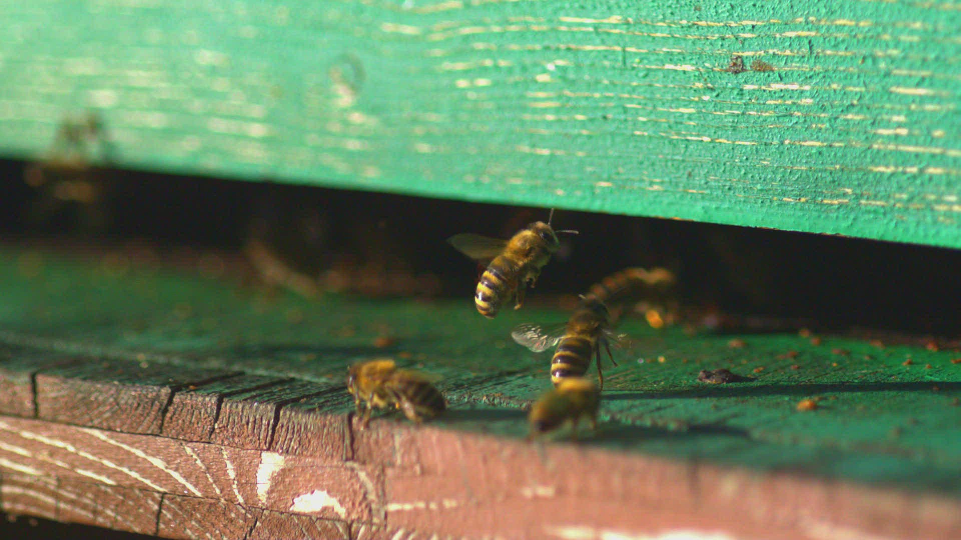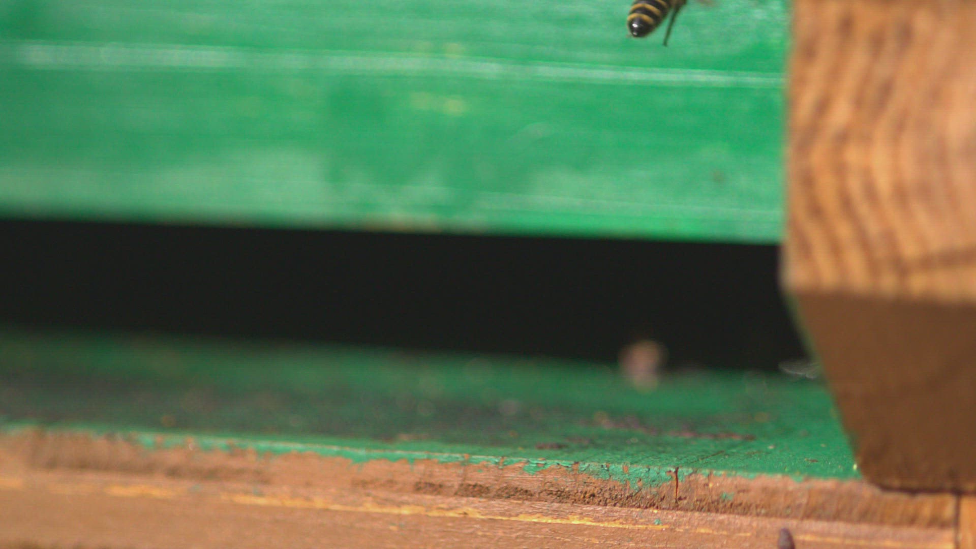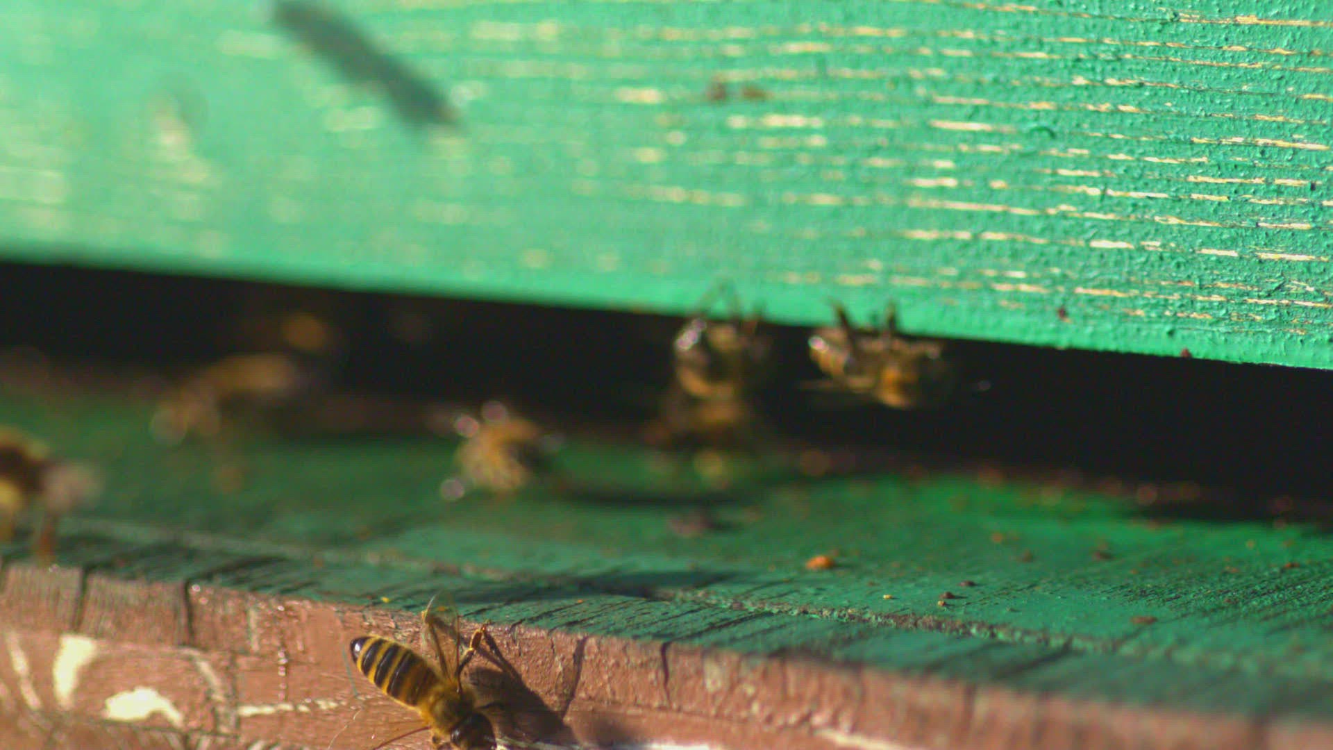 honey bees landing on doorstep of bee hive