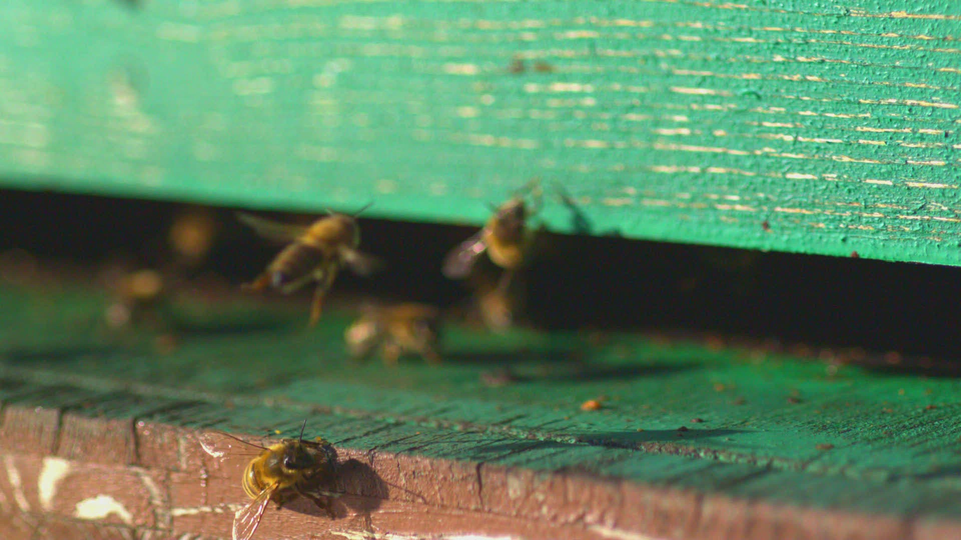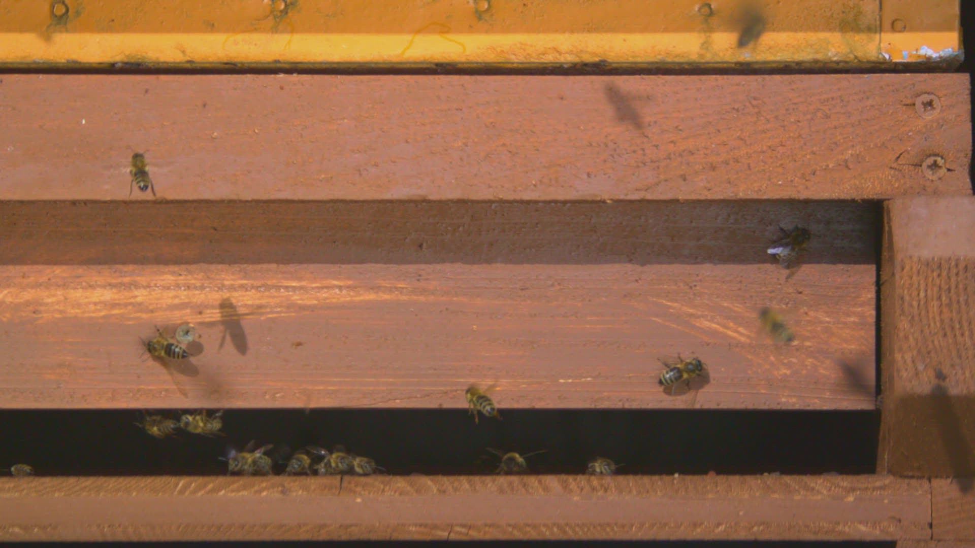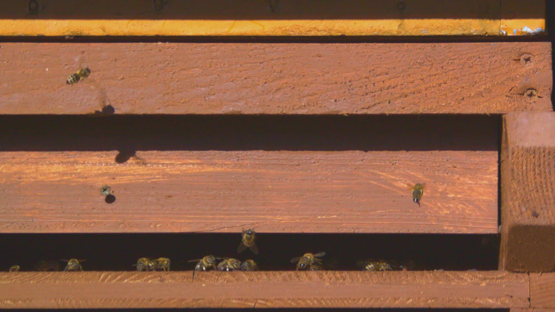 honey bees landing on doorstep of bee hive