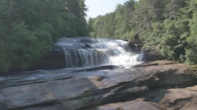 Camera is low over water, pushes in and rises up over waterfalls.