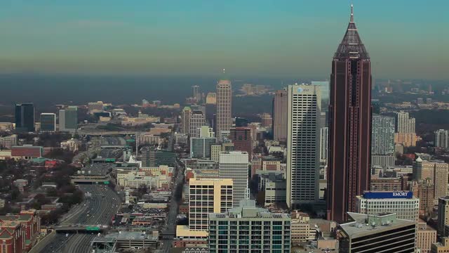 A static shot of the Suntrust Plaza in Atlanta, Georgia while going up in a moving elevator. Other buildings in the Atlanta Skyline can be seen during the day.