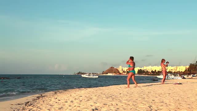 Static shot of women on the beach. Other people are seen in the background. There is a motorboat floating nearby and some buildings are seen on the beach.