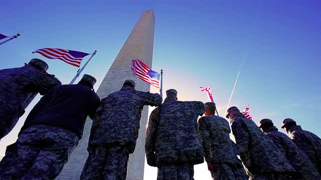 A tracking shot of the back of soldiers standing by a large pillar in the Lincoln Memorial in Washington DC. The soldiers are standing in the shadows of the pillars. The Washington Monument can be seen in the distance.