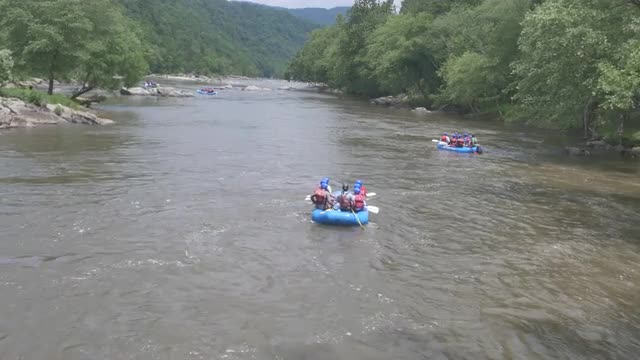 Camera dollies camera right and reveals rafters in river.
