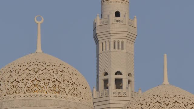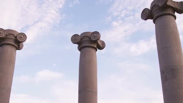 A static shot of the US Capitol with a historic statue in front of it at night. A single flag blow in the wind in front of this historic building