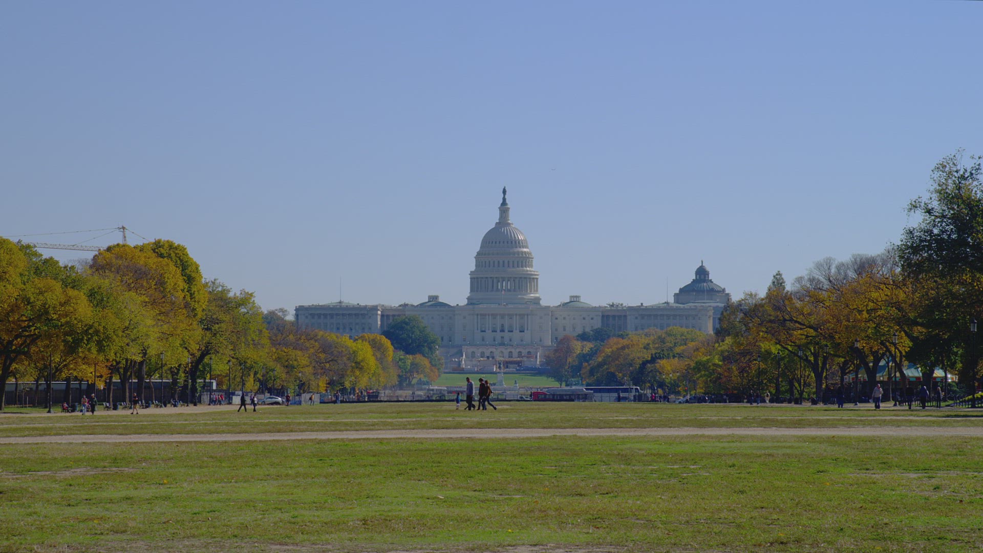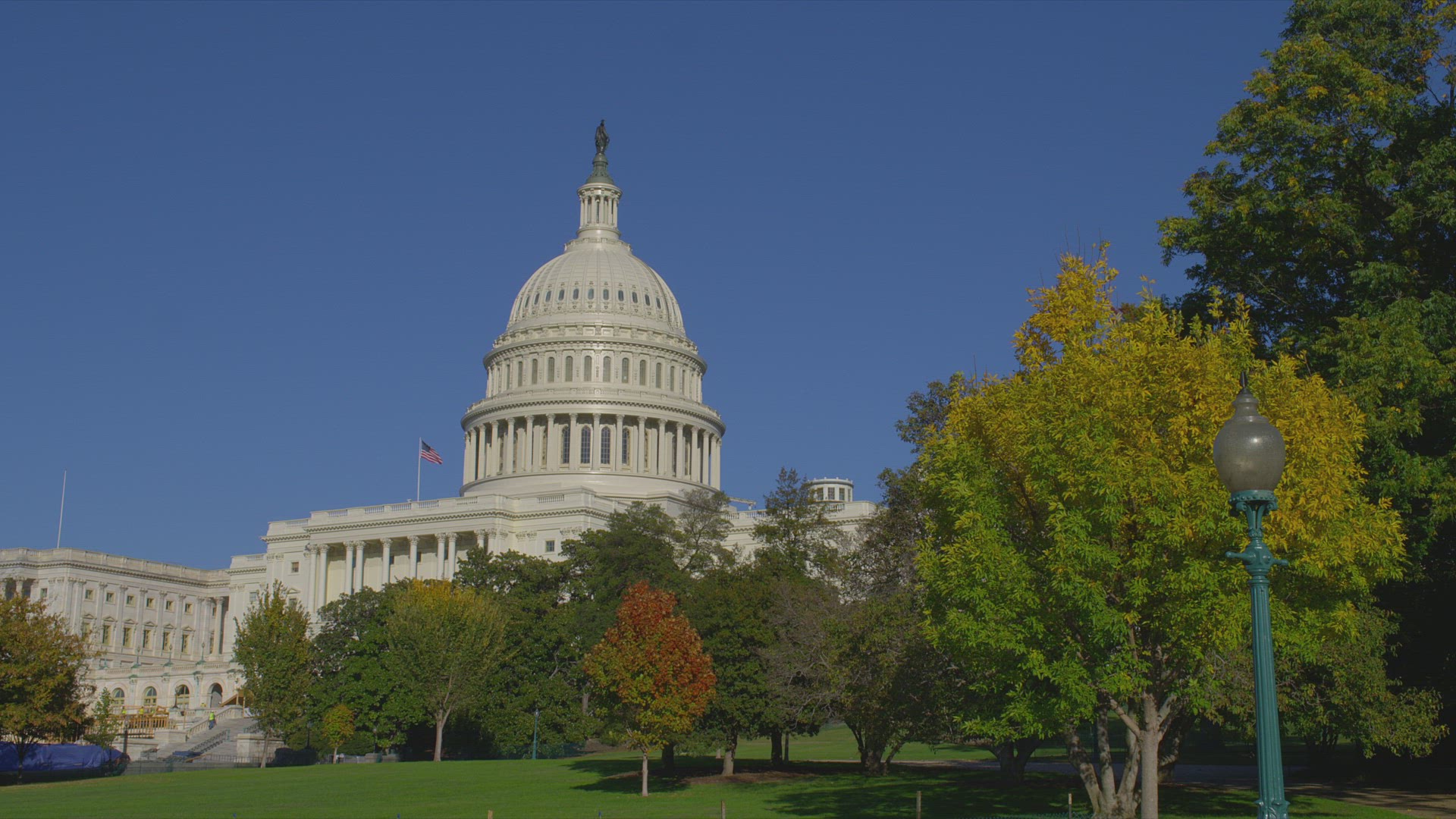 > A time laspe static shot of the the U.S. Capitol at sunset in Washington DC.