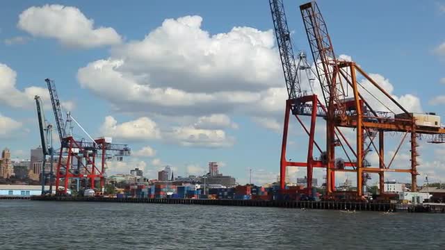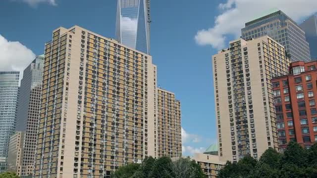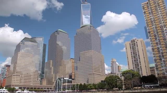 > Zoomed view of the New York City Skyline while floating the East River by ferry.