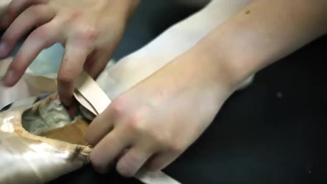 Tracking shot of woman flexing her feet in en pointe ballet shoes.
