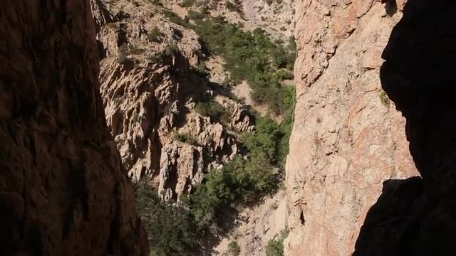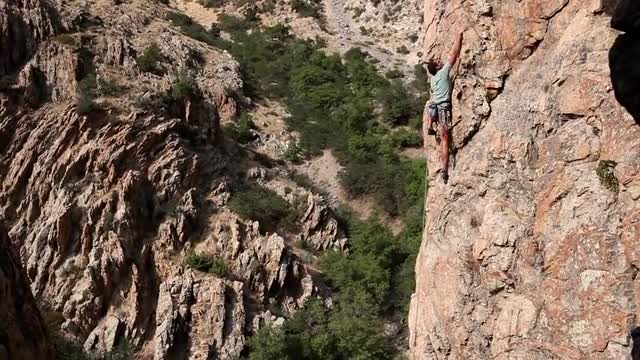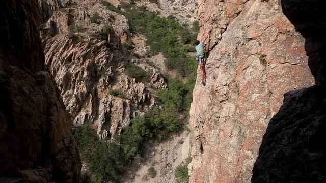 > Handheld shot of a rock-climber climbing a cliff.