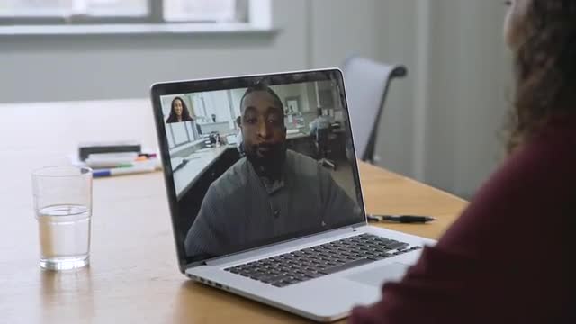 925862 - Businesswoman video chatting with businessman in startup office