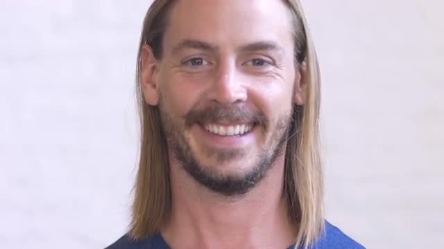 Closeup shot of a somber man with a ponytail suddenly breaking his composure.