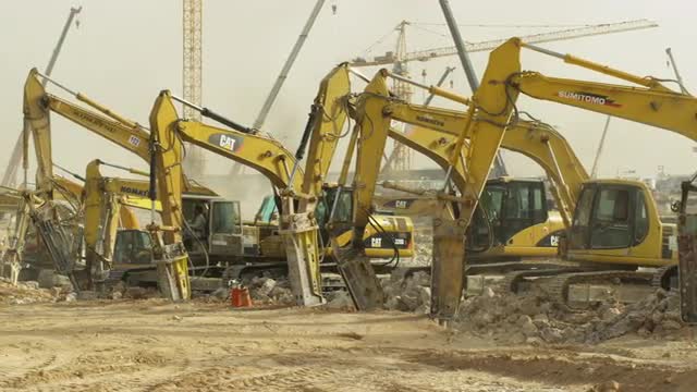 > Diggers break up concrete on a construction site, Riyadh, Saudi Arabia.
